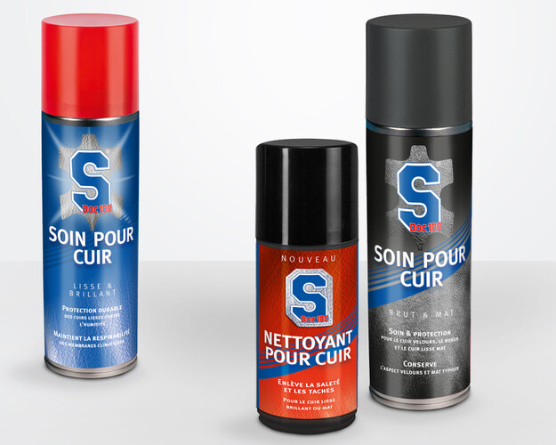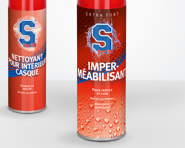 Speziell für den anspruchsvollen französischen Markt wurden diese Leder- und Textilpflege-Produkte designt. Es wird hier der anspruchsvolle Motorradfahrer angesprochen, der auf hochwertige Pflege seiner Funktionskleidung wert legt. Die Produktanwendung wird jeweils um das SDoc100 Logo und im Hintergrund gezeigt. So erkennt man das richtige Pflegemittel schon intuitiv. Die Grundfarben der Marke – Rot und Blau – bleiben dabei in immer neuen Kombinationen erhalten.
