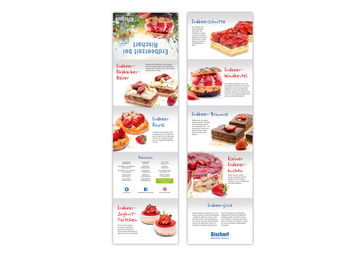 Für saisonale Produkte wie hier den Windbeutel konzipieren und erstellen wir Plakate in allen Anwendungsgrößen. Zu den Erdbeer-Windbeuteln gab es ein A1 Plakat und Textilbanner. In-Store wurden dann dazu passende Zick-Zack-Flyer mit allen Erdbeer-Spezialitäten verteilt.